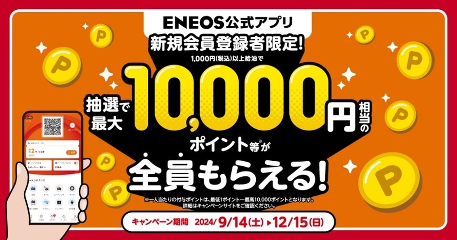 当社(社長:山口 敦治)は、9月14日(土)から12月15日(日)までの間、ENEOSのサービスステーション(以下、「SS」)において、ENEOS公式アプリを新規に会員登録いただき、給油いただいたお客様を対象に、ENEOS公式アプリ新規会員登録者限定!「抽選で最大10,000円相当のポイント等が全員もらえる!キャンペーン」※1(以下、「本企画」)を実施しますので、お知らせいたします。