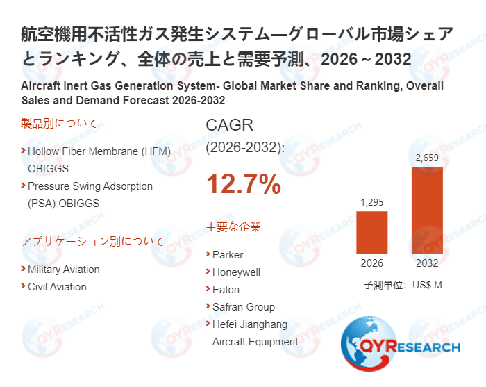 QYResearchが発表した新たな市場調査レポート「航空機用不活性ガス発生システム―グローバル市場シェアとランキング、全体の売上と需要予測、2026~2032」によると、世界の航空機用不活性ガス発生システム市場規模は2024年の約1162百万米ドルから2025年の1295百万米ドルへと順調に拡大すると見込まれ、予測期間中は年平均成長率(CAGR)12.7%で成長し、2031年には2659百万米ドルに達すると予測されている。