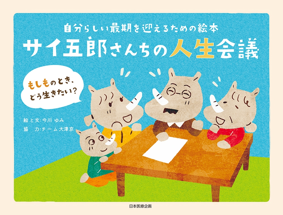 “私たち『在宅療養サポートチーム:チーム大津京』は、「リビング・ウィル」や「人生会議」をわかりやすく伝える[自分らしい最期を迎えるための絵本 ─ サイ五郎さんちの人生会議」を出版し、明るい気持ちで気軽に実践するための人生会議ツールとして[サイ五郎さんちの対話カード][人生会議の議事録][サイ五郎さんちの用語集]を作ることにしました。”※1