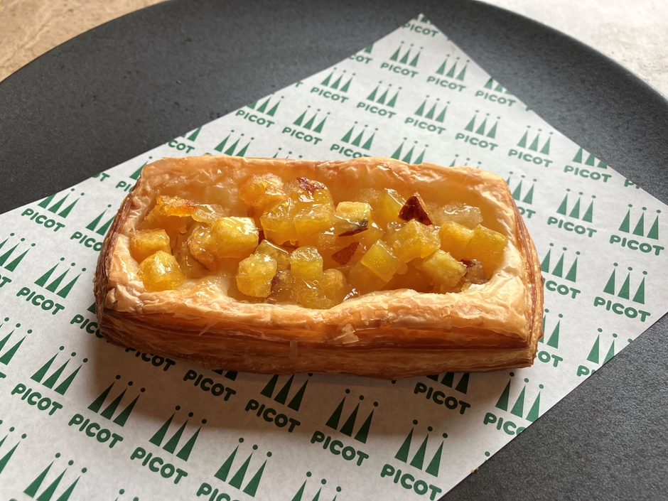 りんごとサツマイモの甘露煮をたっぷり使ったデニッシュパンです。