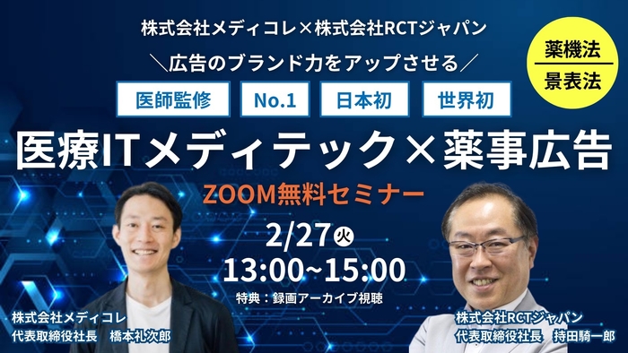 株式会社RCTジャパン(本社:東京都渋谷区、代表取締役:持田 騎一郎、以下、RCTジャパン)は、景表法違反、薬機法違反になりやすい「No.1」「医師監修」「日本初」「世界初」の正しい表示法を解説するオンラインセミナーを開催します。