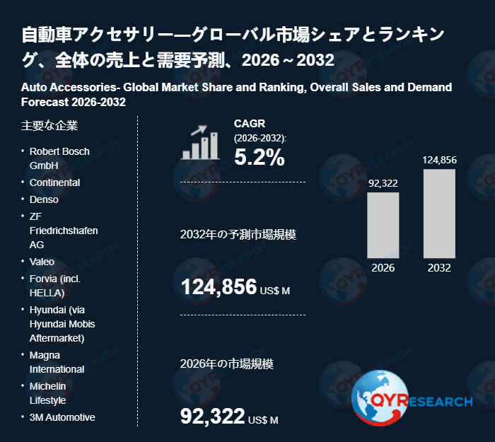 QYResearchが発表した新たな市場調査レポート「自動車アクセサリー―グローバル市場シェアとランキング、全体の売上と需要予測、2026~2032」によると、世界の自動車アクセサリー市場規模は2025年の約88040百万米ドルから2026年の92322百万米ドルへと順調に拡大すると見込まれ、予測期間中は年平均成長率(CAGR)5.2%で成長し、2032年には124856百万米ドルに達すると予測されている。