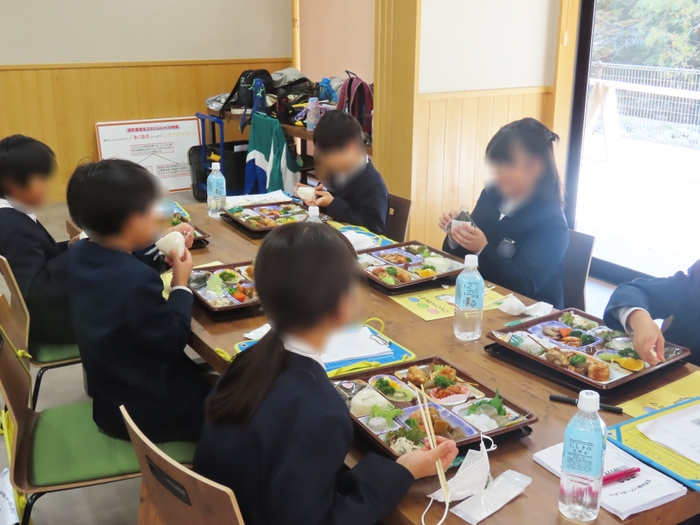 昼食は、錦町農産加工様に特別にご用意いただいた、こんにゃくを使ったお弁当をいただき、ボリューム満点の弁当に児童も大喜びでした。