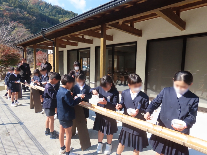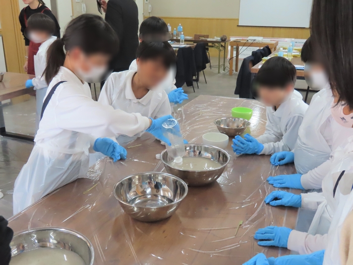 今回の食育体験ツアーは、山口県岩国市の錦町農産加工株式会社のご協力のもと会場をお借りして実施いたしました。初めに、こんにゃくそうめん流しやこんにゃく作り体験を行い、こんにゃくとお水の工場見学も行いました。
