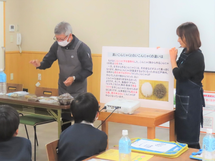 錦町農産加工の田上部長と遠藤次長から、こんにゃく芋の栽培には3年以上もかかることや、こんにゃく芋は寒さに弱いため毎年冬を迎える前に掘り起して春にまた植える作業を繰り返すこと、こんにゃくの成分は9割以上が水分で錦町の美味しいお水で作られたこんにゃくは臭みがなくとても美味しく出来上がることなど、こんにゃく作りに関するお話しして頂きました。