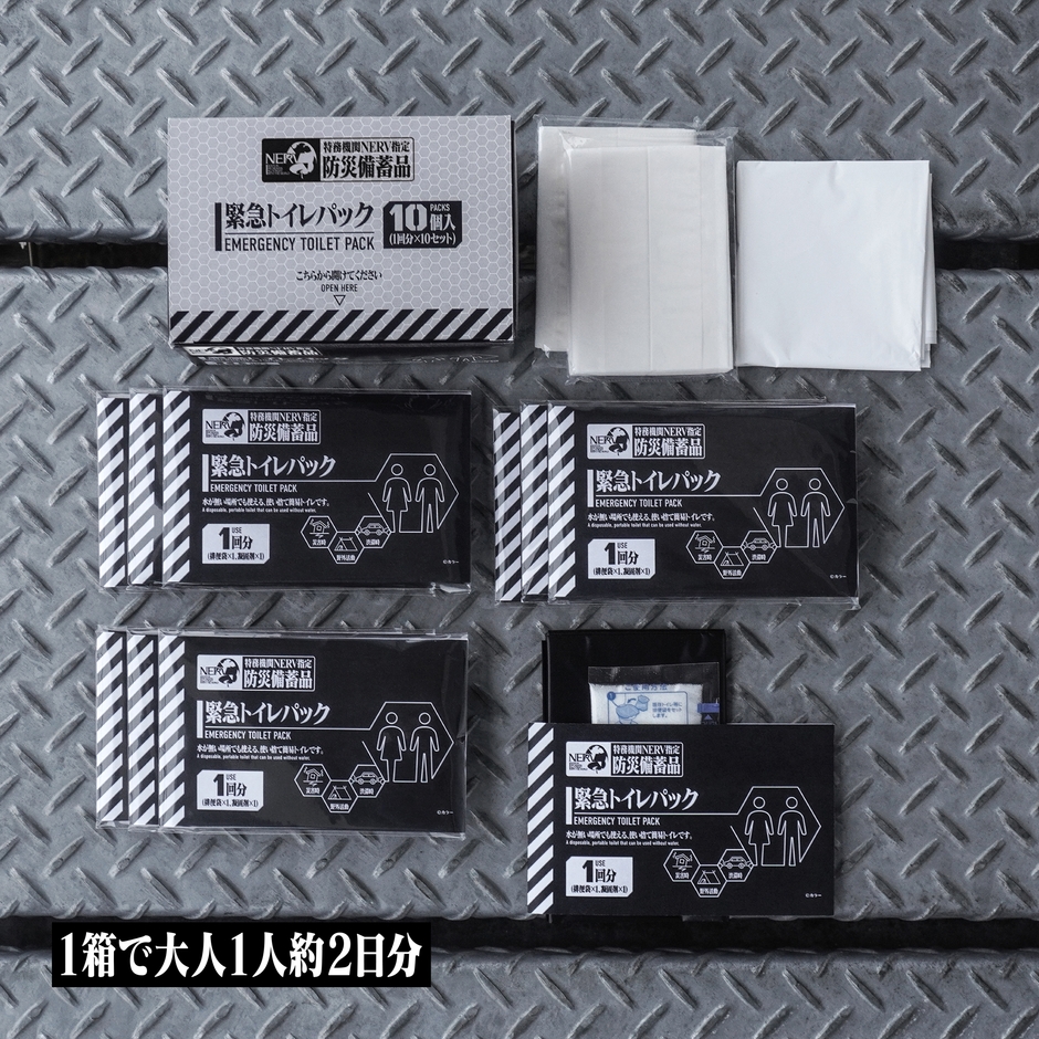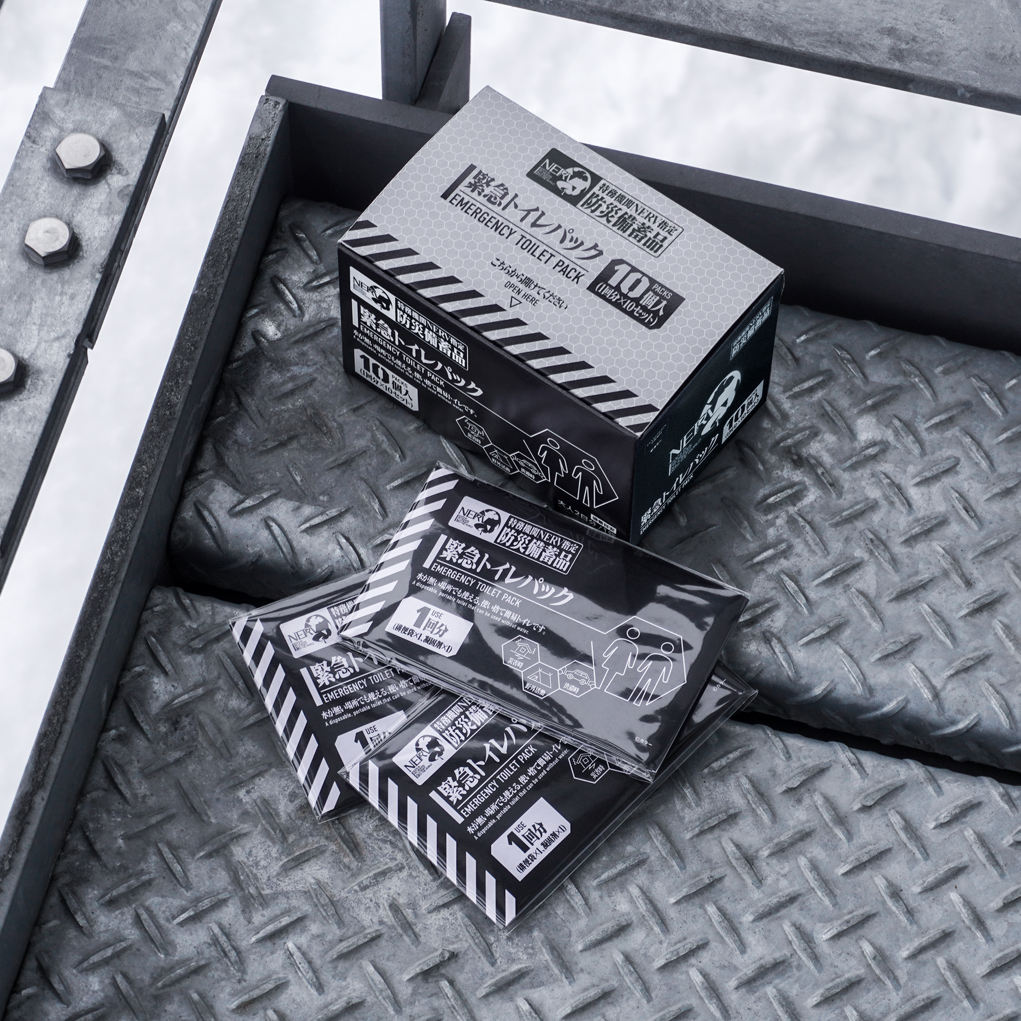 「特務機関NERVから第3新東京市民に配られる備蓄品」をコンセプトとした、まるで劇中から出てきたようなデザインで『エヴァンゲリオン』シリーズファンの方に作品の世界観を楽しんで頂く一方で、食品や照明といったカテゴリーに比べ備蓄が進んでいないとされる「災害時のトイレ」を考えるきっかけになるアイテムとして企画されました。