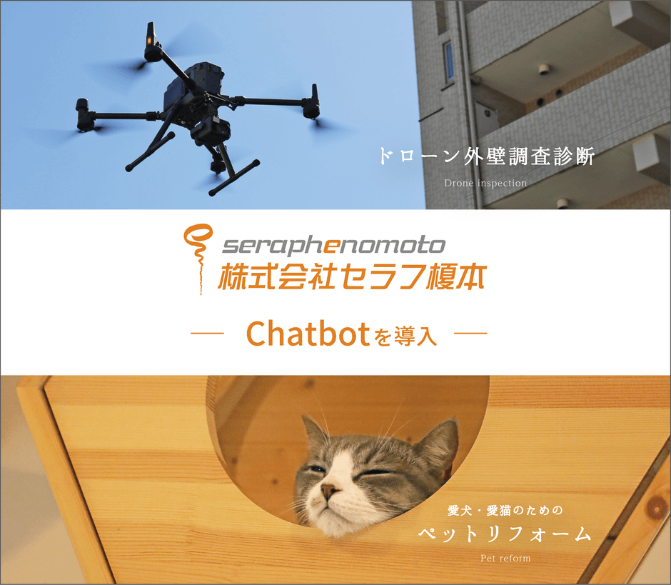 マンション大規模修繕工事を主軸とする株式会社セラフ榎本(所在地:埼玉県川口市、代表取締役:榎本 修、以下「当社」という)は、コーポレートサイトに加え、ドローン外壁調査ホームページとペットリフォームホームページにChatbotサービスを導入しました(以下「Chatbot」という)。両ホームページの質問・回答はFAQのような位置づけで、当社が出展する展示会や見本市で実際に聞かれた内容を踏まえたものとなっております。Chatbotの導入により、ホームページに対する顧客満足度の向上と問い合わせ業務の負担削減などが期待されます。