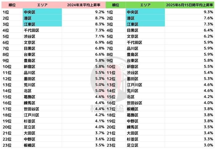 さらに、2024年と2025年前半を比較して特筆すべき動きとして、目黒区と品川区の存在が挙げられます。2024年には目黒区は価格上昇率で7位でしたが、2025年には4位にまで順位を上げています。また品川区も11位から7位へと、急速に順位を伸ばしています。
