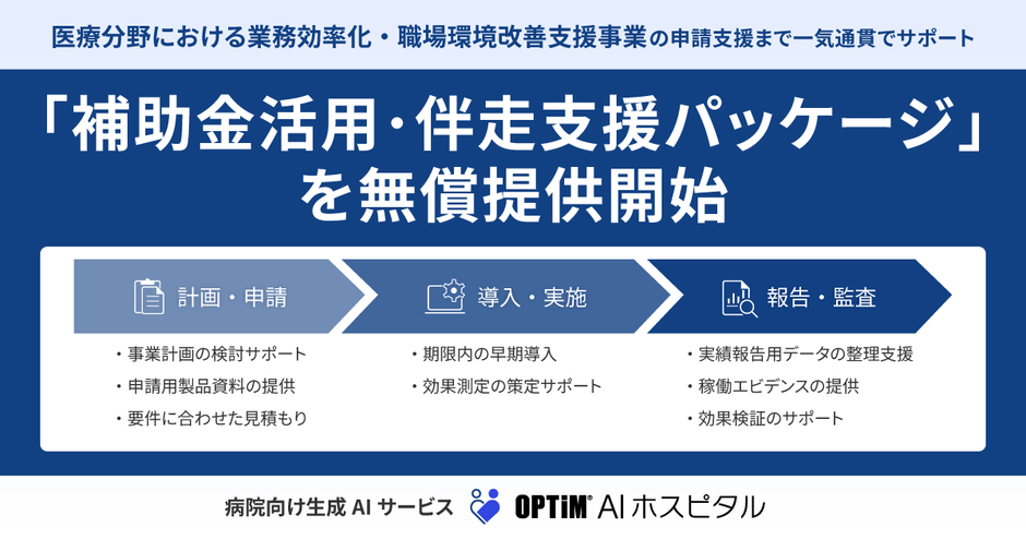AI・IoT・ビッグデータプラットフォームのマーケットリーダーである株式会社オプティム(以下 オプティム)は、医療機関の生産性向上および医療DXを支援するため、病院向け生成AIサービス「OPTiM AI ホスピタル」の導入・利用において、各種補助金の活用をトータルでサポートする「補助金活用・伴走支援パッケージ」の提供を開始いたします。本パッケージは、「OPTiM AI ホスピタル」をご検討・ご利用いただく医療機関への無償の付帯サービスとして提供するものであり、複雑な補助金制度の活用における情報整理を強力にバックアップいたします。