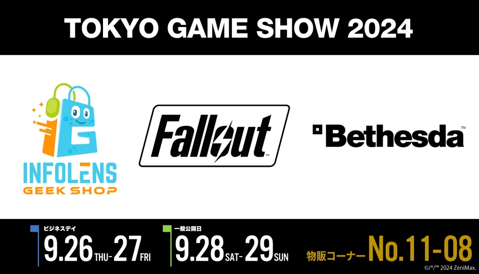 エンターテインメント関連商品を輸入・製造販売するインフォレンズ株式会社(本社:東京都中央区、代表取締役CEO:安川 洋)は、2024年9月26日(木)から29日(日)の4日間幕張メッセで開催される東京ゲームショウ2024にてベセスダ・ソフトワークスと共同で物販コーナー(小間No.11-C08)に出展することを発表いたします。
