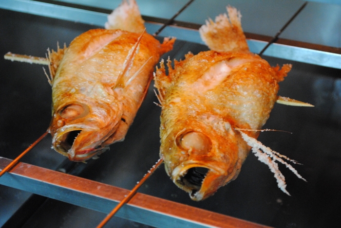 能登の庄の、どのプランにものど黒塩焼き(姿一尾)、朝食にはのど黒の干物をお付けいたします。