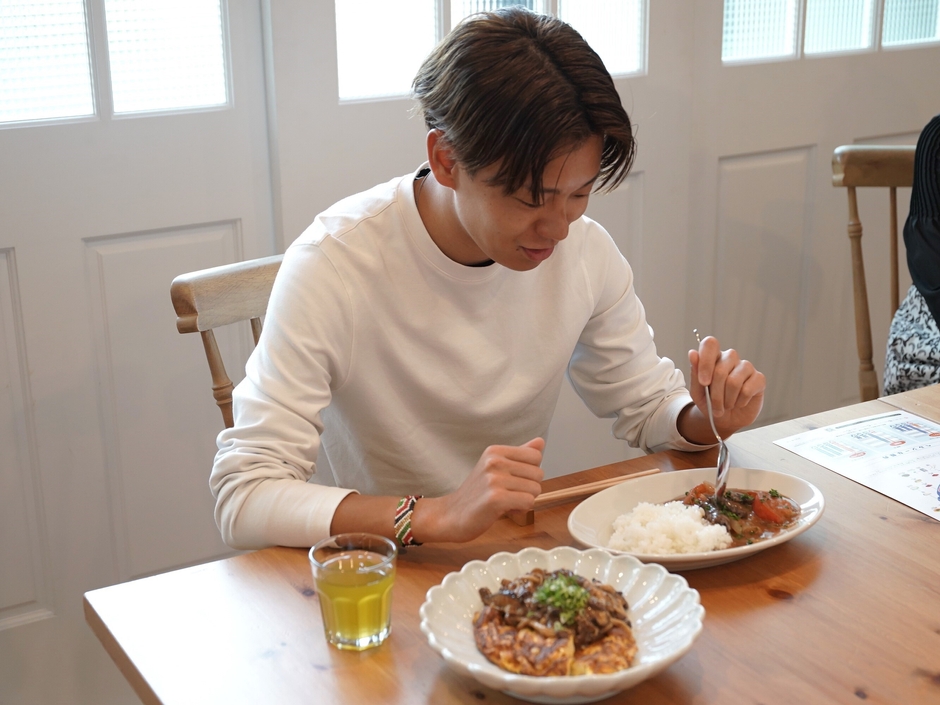 一品目の「ハッシュドクジラ」を食べ、「想像していたような“クジラ感”がまったくないです。牛肉みたい。」「いい意味で予想を裏切られました」と答えました。次に、「クジラとキノコの餡かけ」では「白米が大好きなんですけど、これだけでごはんめちゃいけます(笑)」とお話しいただきました。