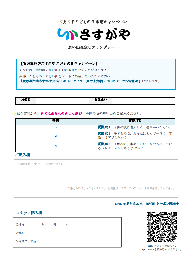 本企画は、査定の待ち時間にお客様ご自身の「こどもの頃の思い出」を専用シートにご記入いただき、そのエピソードを査定員と共有(対話)していただくことで、買取成立時に「査定額20%UP 」をボーナス還元する特別プロモーションです。