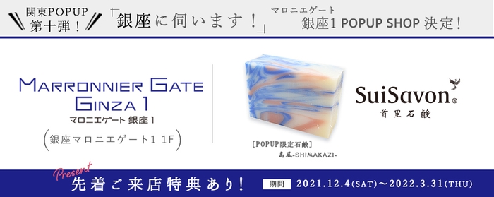 株式会社コーカス(沖縄県那覇市首里末吉町、代表取締役社長 緒方教介)が運営する沖縄県内に13店舗、県外に1店舗を展開するスキンケアブランド「SuiSavon首里石鹸」は、銀座にある「マロニエゲート銀座1」にてPOPUPSHOPをオープンいたします。期間:2021年12月4日(土)~2022年3月31日(木)
