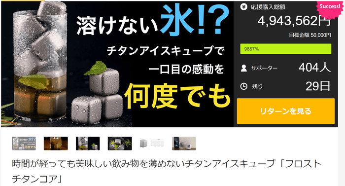 合同会社Storage(所在地:東京都、代表社員:笹原)は、応援購入サービスサイト「Makuake」にて先行販売している、時間が経っても美味しい飲み物を薄めないチタンアイスキューブ「フロストチタンコア」の購入者が400名を突破したことをお知らせします。先行販売は、2024年6月29日18時まで行います。