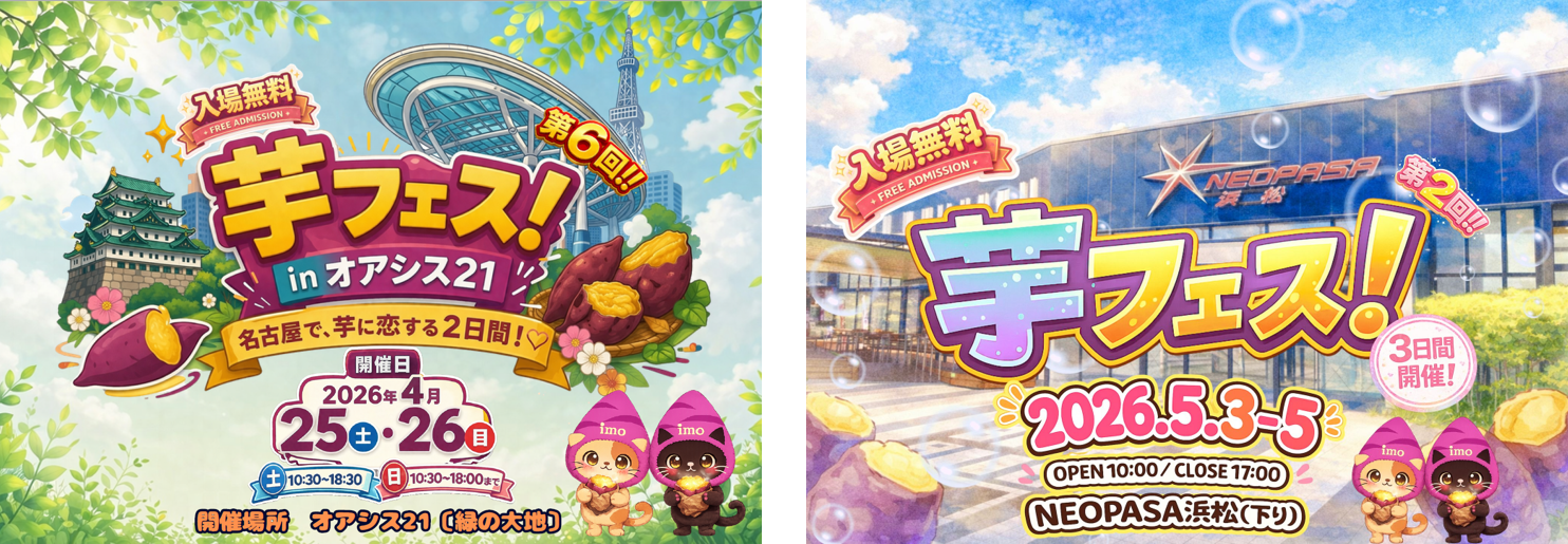 なお、ゴールデンウィーク中は、「第6回芋フェス!IN名古屋」を4月25日(土)・26日(日)に名古屋オアシス21(名古屋市東区東桜1-11-1)で、「第2回芋フェス!」を5月3日(日)~5日(火)にNEOPASA浜松(下り)(浜松市浜名区都田町)で開催します。