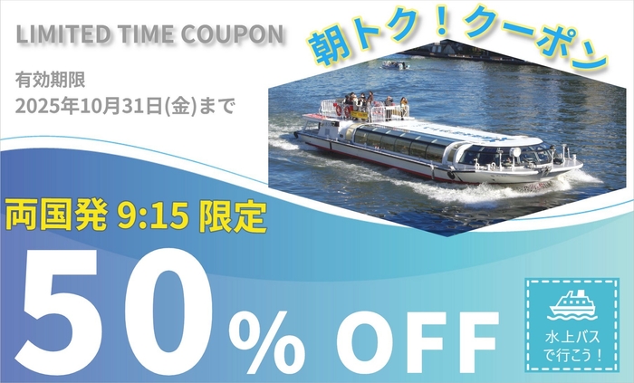 東京水辺ラインでは、10月17日(金)まで両国発9:15にご乗船いただいたお客様に、次回使える「両国発9:15限定 50%OFFクーポン」を配布します。