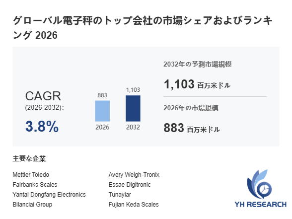 YHResearch調査チームの最新レポート「グローバル電子秤のトップ会社の市場シェアおよびランキング 2026」によると、2026年の883百万米ドルから2032年には1103百万米ドルに成長し、2026年から2032年の間にCAGRは3.8%になると予測されています。