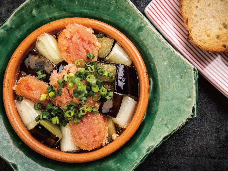 とろける秋ナスと博多明太子の旨辛を、熱々オリーブオイルで仕上げた一品。バゲットとの相性も抜群です。