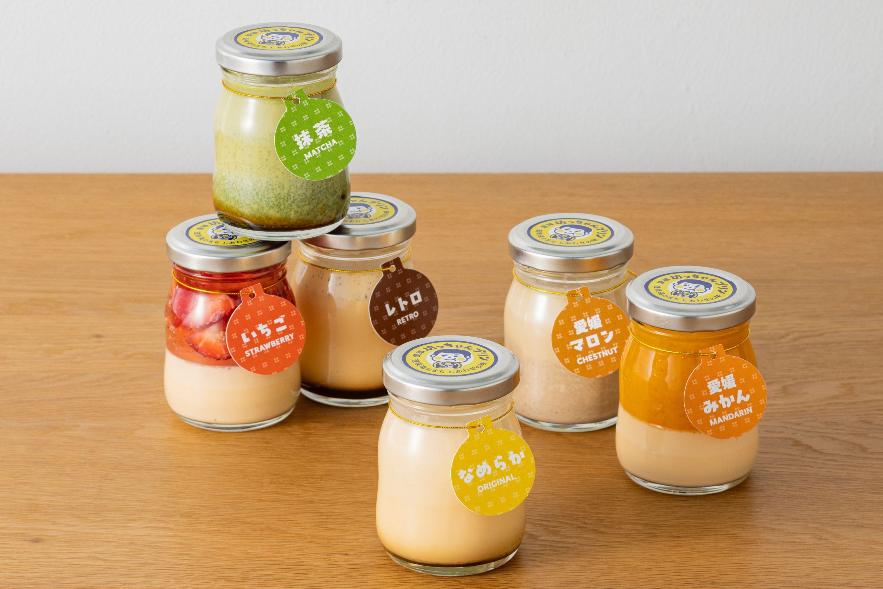 保存料不使用で、店舗併設の工房で毎日ひとつひとつ丁寧に手作りしています。愛媛県産「坊っちゃん牛乳」をはじめ、愛媛みかん、愛媛マロンなど、地域の素材を活かしたプリンをお届けします。