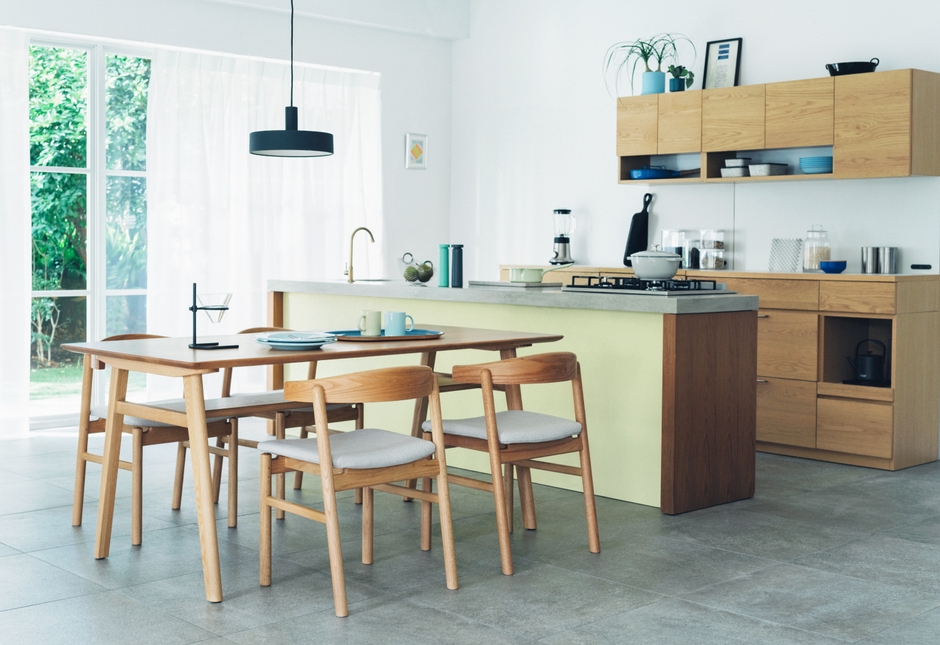 ダイニングはunicoでは初のセミオーダー式を採用。天板のサイズは7種類、脚は3種類と計21通りの組み合わせが可能で、ライフスタイルに合わせて選べます。チェアはお客様からの要望が多かった、お掃除ロボットが使いやすい、テーブルに引っ掛けられる仕様に。キッチン収納はお部屋のサイズや用途に合わせて16通りから選べるユニットタイプ。十分な収納力がありながら、白色のバックパネルと側板を無くすことで、圧迫感を最小限に抑えたデザインに。