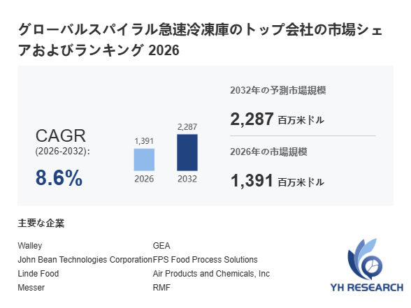 YHResearch調査チームの最新レポート「グローバルスパイラル急速冷凍庫のトップ会社の市場シェアおよびランキング 2026」によると、2026年の1391百万米ドルから2032年には2287百万米ドルに成長し、2026年から2032年の間にCAGRは8.6%になると予測されています。
