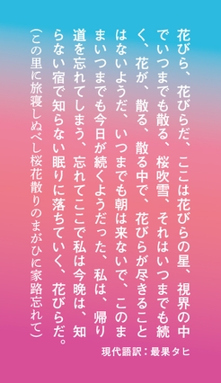 京都が都であった時代に編纂された和歌集から選ばれた6つの和歌を現代語訳詩に。全て今回のための書き下ろしとなっています。京都タワーサンド公式Instagramにて4/22以降に順次投稿予定です。