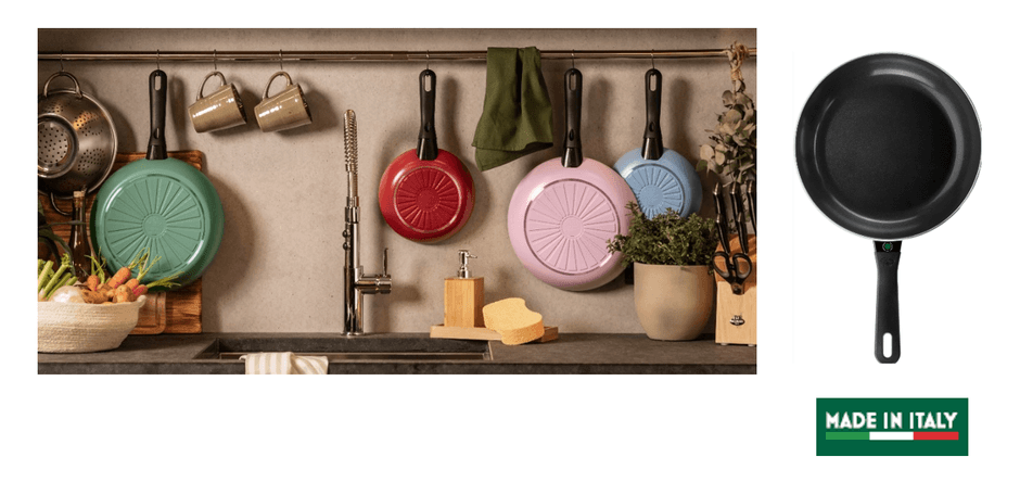 「カプレラ」シリーズは、ツルッとしたなめらかな表面に食材がくっつかずよく滑るケラグロス・コーティングを採用し、思わずプロのようにフライパンを振りたくなる新感覚の快適さが特徴のバッラリーニ フライパンの新ラインアップです。