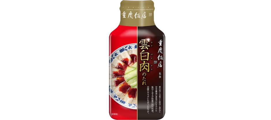 横浜中華街で1959年創業の中華料理店「重慶飯店」監修の本格的な中華調味料商品です。雲白肉(ウンパイロウ)とは、茹でて薄切りにした豚肉と胡瓜に、にんにくや山椒などが効いた甘辛い醤油味の香味だれをかけた四川料理の前菜メニューです。豆腐やサラダなどのメニューにも使用できる他、パッケージ裏面のQRコードからアクセスしたサイトにアレンジレシピも掲載しています。