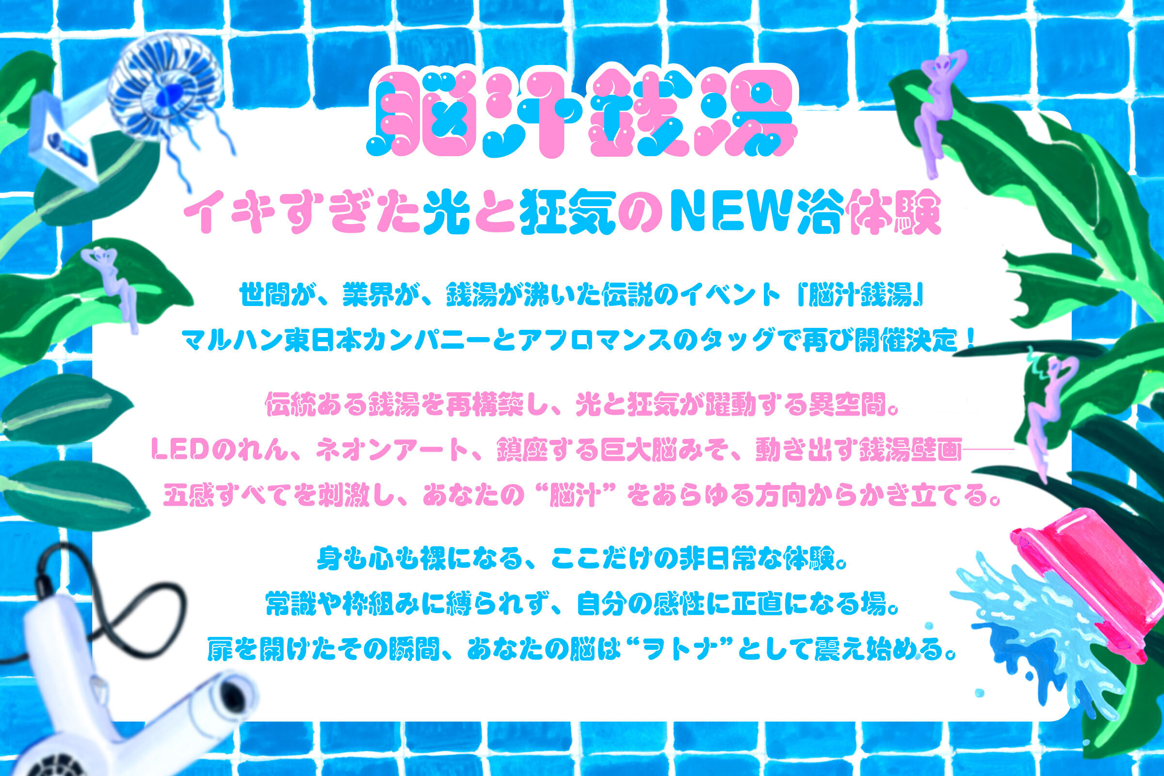 マルハン東日本「ヲトナ基地プロジェクト」第5弾イベント 2024年に10日間で4,000人以上を集めたイベントの 2ndシーズンが到来! 巨大な脳みそが浮かぶ光輝くサイバー銭湯が帰ってくる! “イキすぎた光と狂気のNEW浴体験”『脳汁銭湯2025』開催 11月26日(水)から12月7日(日)、 大田区蒲田「女塚温泉 改正湯」にて実施
