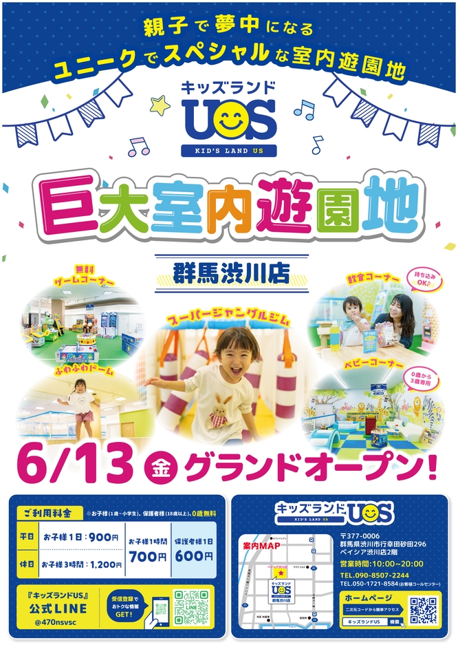 巨大室内遊園地の運営を行うユーエスマート株式会社(所在地:三重県伊勢市、代表取締役社長:小山 毅志)は、室内遊び場『キッズランドUS 群馬渋川店』(所在地:〒377-0006 群馬県渋川市行幸田砂田296 ベイシア渋川店2階)を2025年6月13日(金)にオープンいたしました。