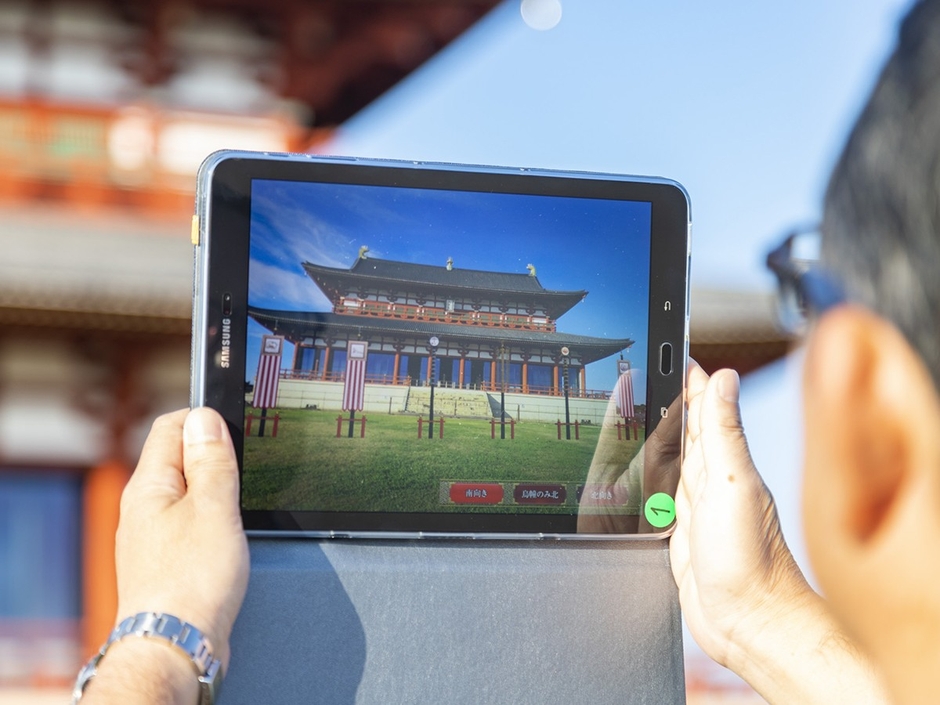 平城宮跡第一次大極殿院 東楼竣工記念講演会「よみがえる"東楼" ―世界遺産平城宮跡における建造物の復原を考える―」に先立ち、第一次大極殿院の発掘調査で確認された儀式用の旗の復元CGを画面上で立ち上げる、ARアプリ「AR宝幢・四神旗」の体験会を開催します。