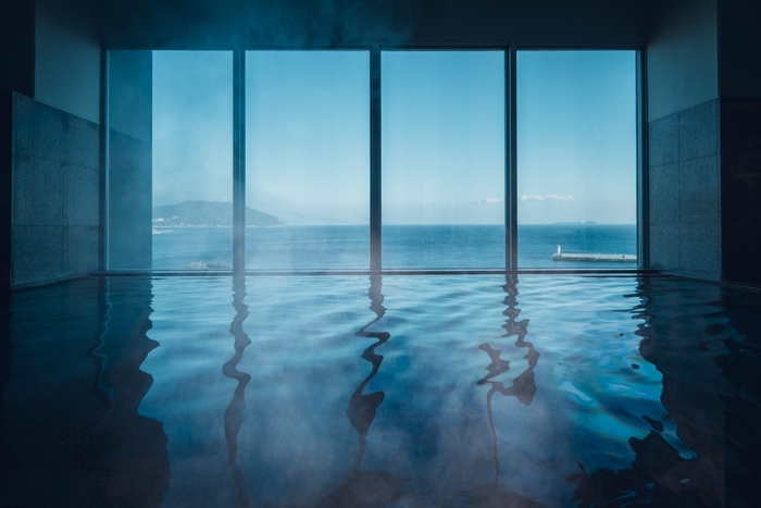 英国人航海士・三浦按針ゆかりの地、静岡県伊東市に位置する全室オーシャンビューの宿。館内随所に海や船旅をテーマにしたデザインが配されたモダンな空間が特徴です。船の甲板をイメージした湯上がり処「サンブエナデッキ」では海風を感じられます。