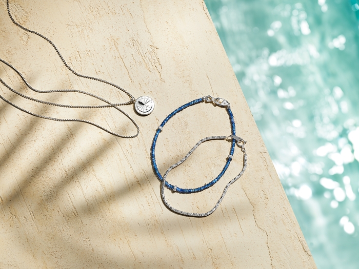 写真左より時計回りにPT850 シックスチェーンネックレス 179,850円(税込)、PT850 カットボールチェーンネックレス 149,600円(税込)、PT950×ダイヤモンド サンダイヤルペンダントトップ319,000円(税込)、K18WG×ブルーサファイヤ×ダイヤモンド ロウエナジーブレスレット269,500円(税込)、PT950 テンダーライトブレスレット 199,650円(税込)