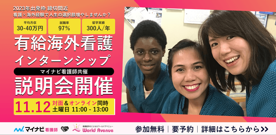 株式会社ワールドアベニュー(所在地:東京都新宿区、代表取締役社長:松久保 健太)は、2022年11月12日(土曜)、海外看護有給インターンシップ・プログラム説明会をマイナビ看護師と共同開催いたします。本説明会では日本最大級の看護師転職サイト「マイナビ看護師( https://kango.mynavi.jp/ )」を運営するマイナビ看護師様にもご登壇いただき、留学前後の看護師の働き方として注目を集める「トラベルナース」についてもご紹介いただきます。