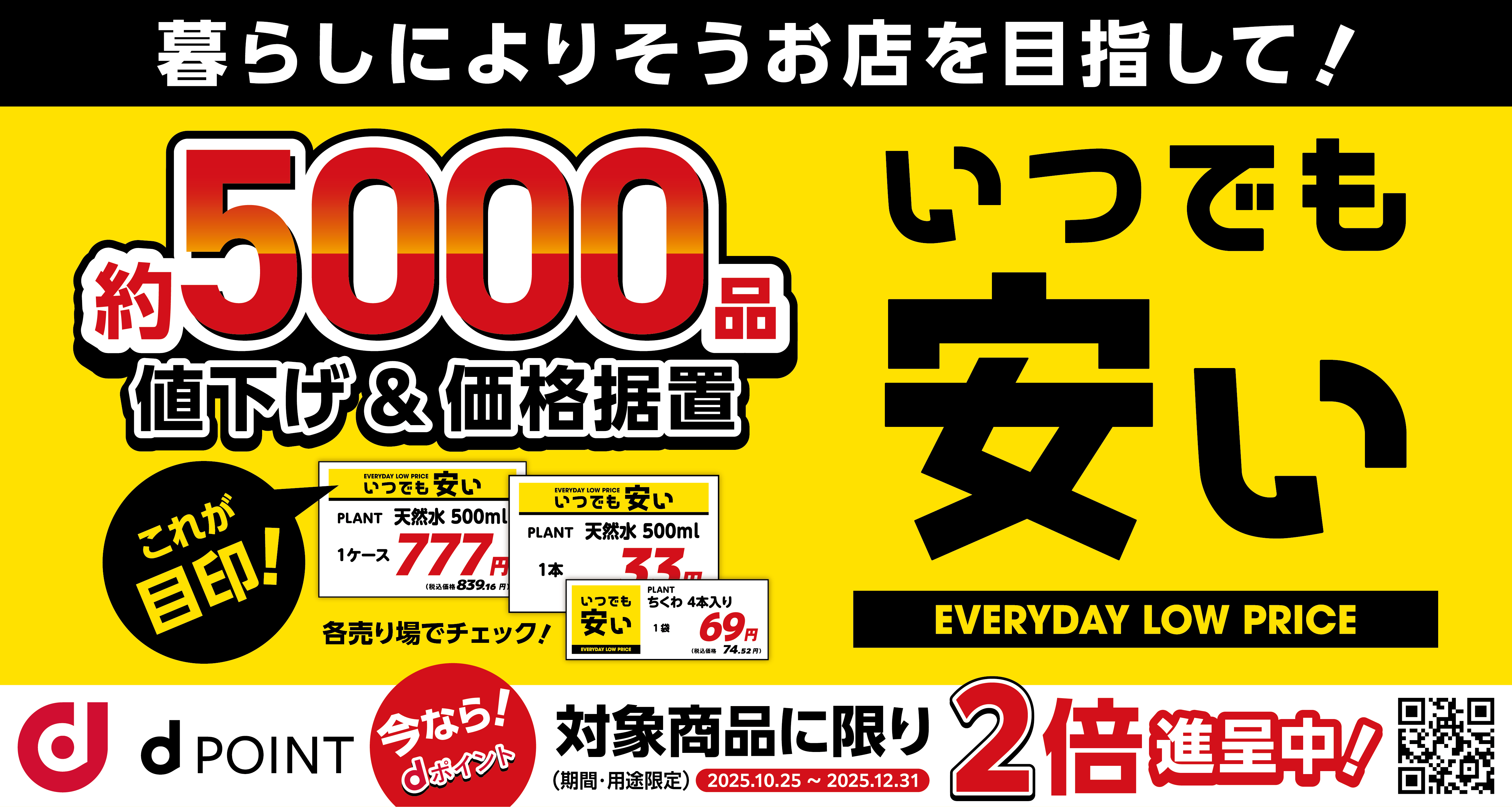 この度、対象商品が約5,000品となりましたので、改めてエブリデイロープライス企画『いつでも安い』を2025年10月25日(土)より開始いたします。