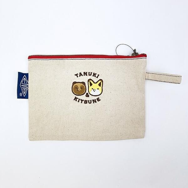 裏側にもタヌキとキツネのお顔が刺繍されています。綿100%の素材でできており、どんな場面でも使いやすいナチュラルなポーチとなっています。