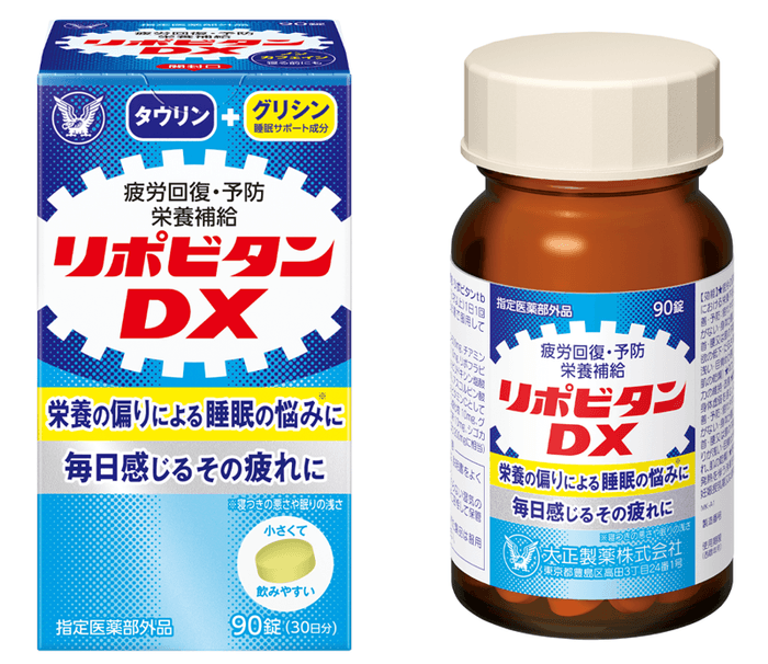 リポビタンDXは、「リポビタン(錠剤)」として発売されたブランド第一号製品以来の、約40年ぶりに登場した錠剤タイプの疲労回復を目的としたビタミン剤です。15才以上1日1回3錠の服用で、エナジーサイクルに働きかけるタウリン500mgやビタミンB1,B2,B6が摂取できます。また睡眠サポート成分のグリシンとシゴカを配合しており、しっかり寝たのに起きた瞬間から疲れている方におすすめの製品です。さらに、おやすみ前の服用を考えて、カフェインを配合していないのも特長です。