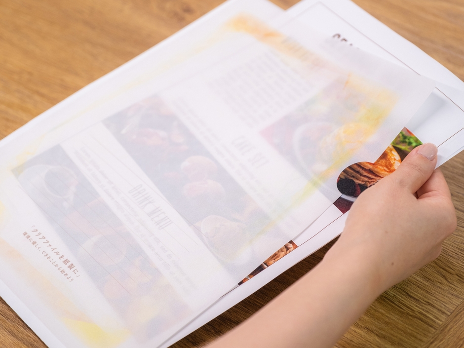 当社の紙製クリアファイルは通常の用紙に特殊な加工をすることで狙った部分を半透明にすることができ、利便性と価格面を両立した製品となります。