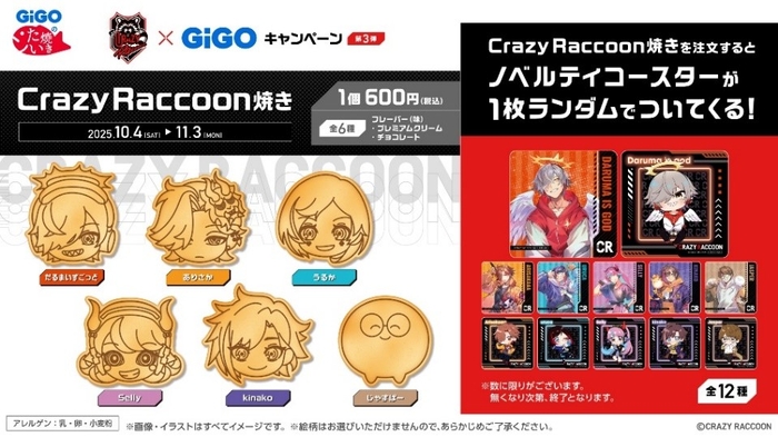 GiGOのたい焼きにて、「Crazy Raccoon」所属のストリーマー6名をモチーフにしたコラボたい焼き「Crazy Raccoon焼き」を販売いたします。「Crazy Raccoon焼き」ご購入1点につき、オリジナルコースター(全12種)をランダムで1枚進呈いたします。