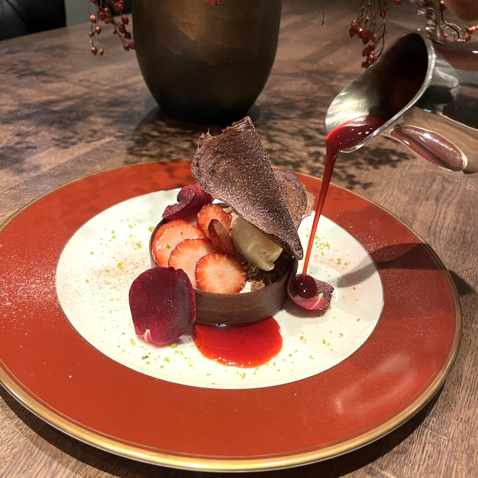 これに加え、デザートの土台部分にはパリパリとしたチョコレート生地を使用し、食感の変化を楽しむことができます。一口ごとに異なる驚きと満足感を味わえる構成です。