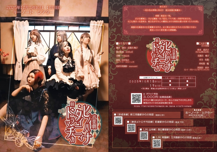 社会⼈パフォーマンスサークルSpirale(代表:花墨⽉ 梅⼦)主催、音楽劇『ヒノハナ・タイニィ=ドラマチカ』が2025年10月18日 (土) 〜 2025年10月19日 (日)にキーノートシアター(東京都 荒川区 西日暮里 1丁目1-1)にて上演されます。