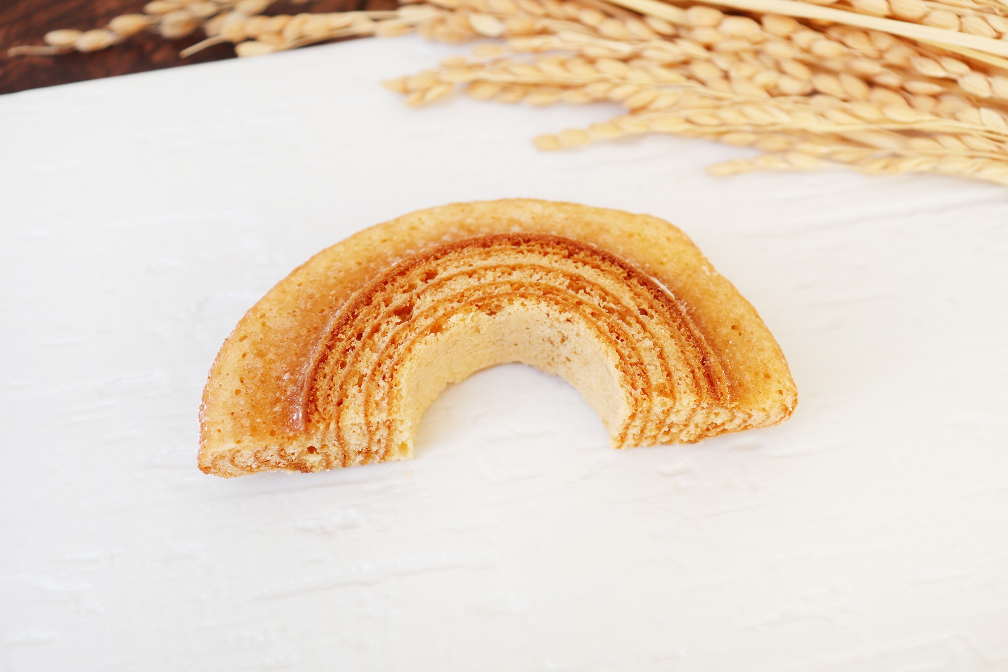 「ハードバウム玄米」は、当社で生産したお米を使用し、自家製米粉100%で仕立てたグルテンフリーのバウムクーヘンです。噛むごとにカリッとした香ばしい食感が際立ち、中はつきたての新米特有のもっちり感がある味わいを特徴としています。