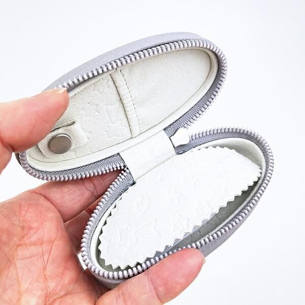 ファスナーを開けると、アクセサリーが飛び出さないよう保護カバーが付いているのですが、実はこの内側にも注目。保護カバーやフタの裏側には、さりげなく型押しモチーフが施されているんです。