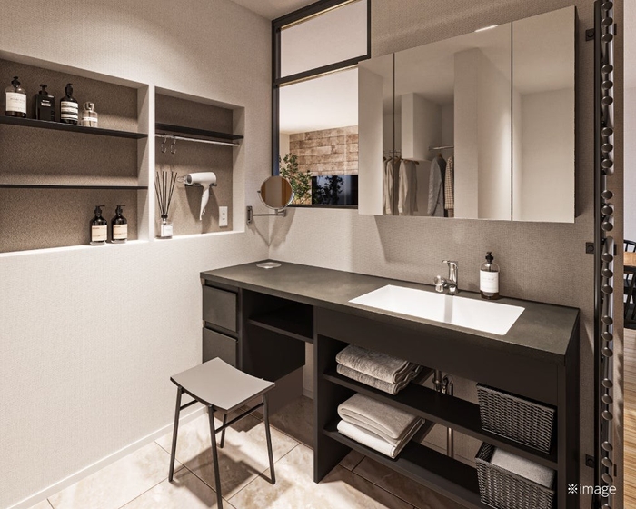パウダールームは、広々としたカウンター付きで、座ってじっくりとスキンケアやメイクができる贅沢な空間です。ニッチ収納、タオルウォーマー、ドライヤーホルダーなども完備し、快適性と時短を両立させました。日々のストレスを忘れ、自分自身と向き合うための大切な場所となります。