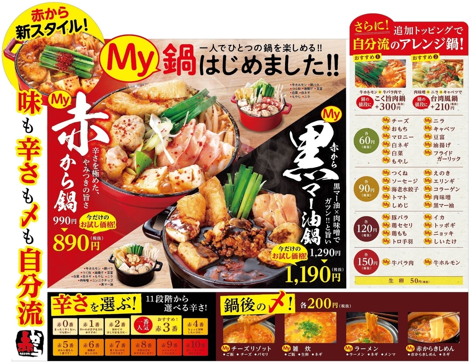 「赤から」がwithコロナ時代の1人用の鍋「赤からMy鍋」を 4店舗にて11月1日から特別価格で提供開始! 追加具材で自分流にカスタマイズも