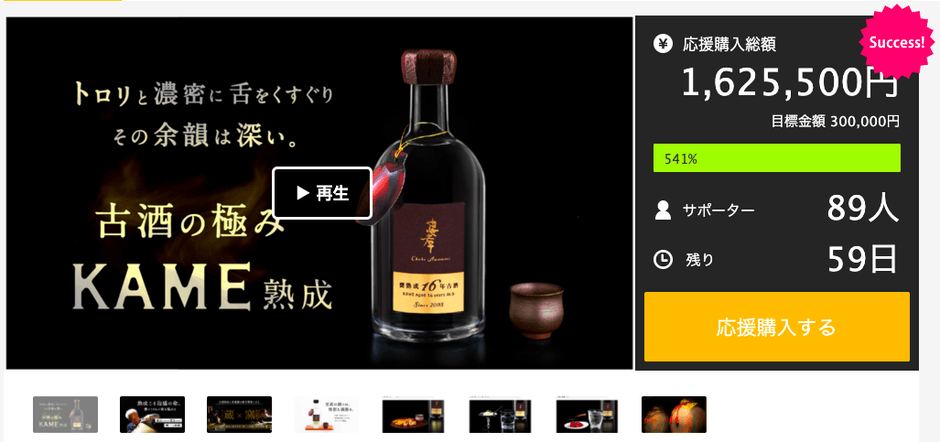 その第一弾として10/10(日)クラファンサイトMakuakeで『貯蔵1.08%、古酒の極み。トロリと濃醇な秘蔵甕熟成16年古酒泡盛』を公開。開始2日で目標金額の541%である1,625,500円を達成致しました。