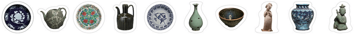 五彩牡丹文盤(「大明萬曆年製」銘)、黒釉堆線文水注、青花枇杷鳥文盤、飛青磁花生、油滴天目茶碗、瑠璃地白花牡丹文盤、加彩婦女俑、青磁象嵌童子宝相華唐草文水注、法花花鳥文壺、青磁彫刻童女形水滴