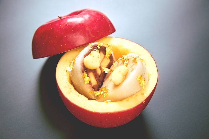 2つに割れたりんごの中には白餡とこし餡2種類の大福が!よく見るとハート型のアップルも!