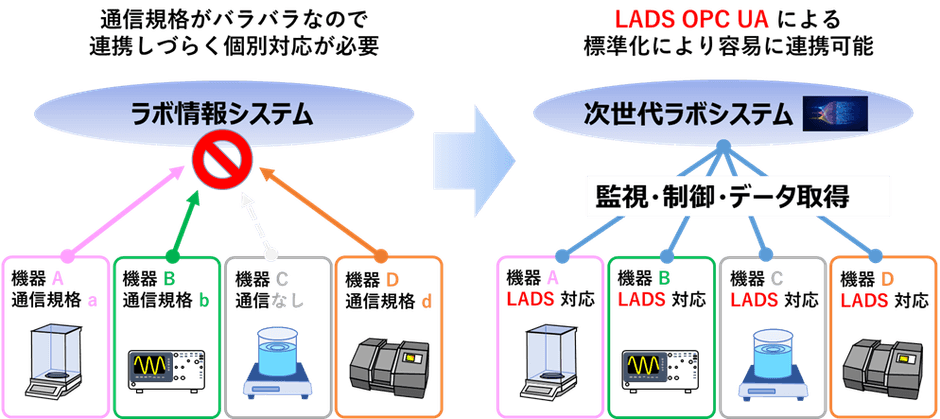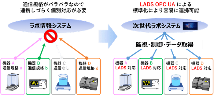 両者は、これらのボトルネックを取り除き、ラボのDXをより推進するため、国内初となるラボ用機器の通信および相互運用規格の適用に向けた取り組みを行い、LADS OPC UAの早期普及を目指します。LADS OPC UAを導入し、多くの実験機器をプラグ&プレイ※3でつなぐことで、容易かつセキュアに実験機器の遠隔監視・制御やデータの取得蓄積が可能になります。さらに、複数の実験機器や研究者間の効率的な連携も可能となるため、自動化にかかる時間やコスト、技術的な制約を減らせます。
